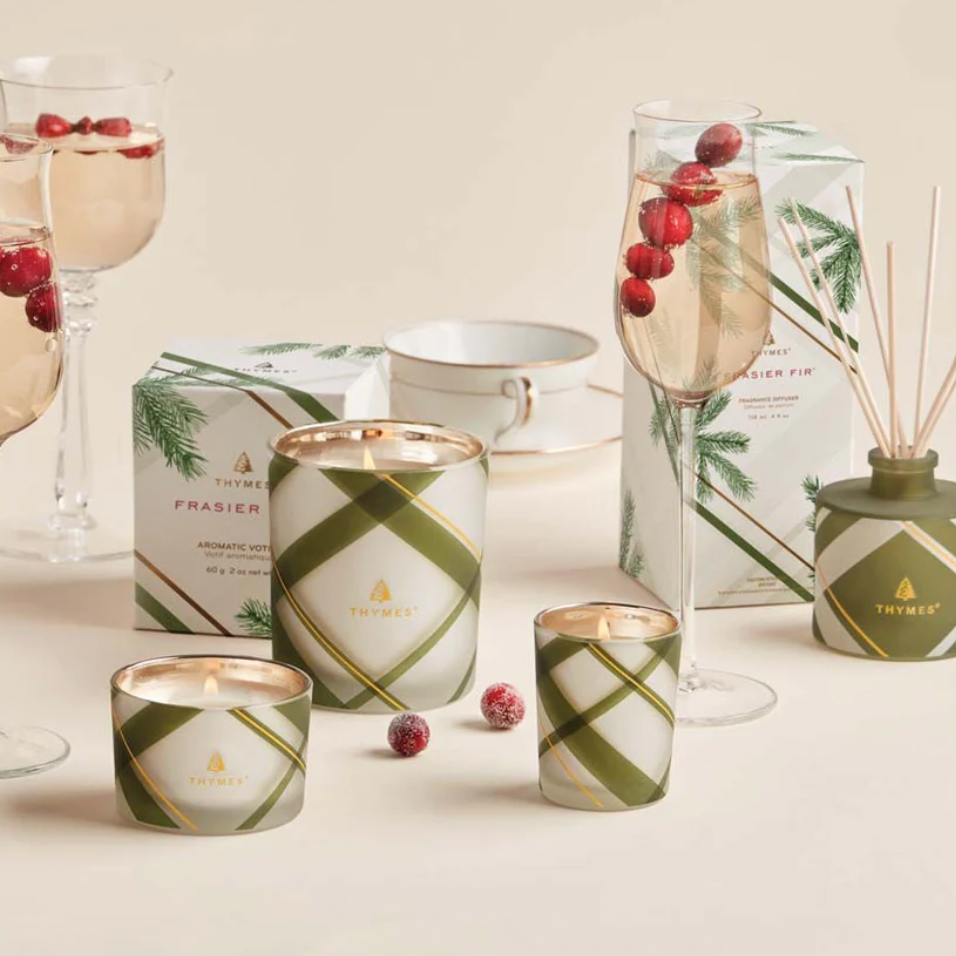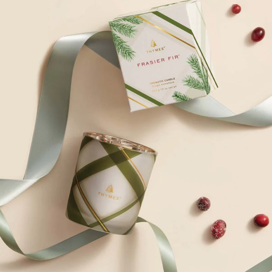 Cozy up with this unique plaid-patterned candle and enjoy the traditional, yet modern, aroma of Frasier Fir!