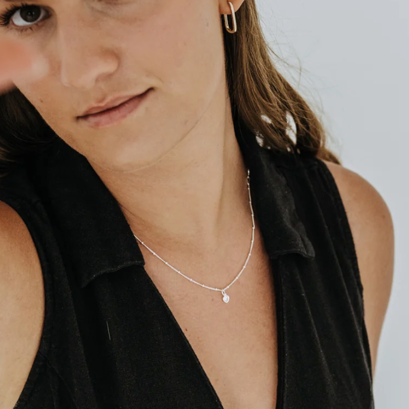 This dainty heart pendant is set with a sparkling cubic zirconia and floats effortlessly along a delicate 18" Sterling Silver Satellite chain. Perfect for everyday wear or layered with your other favourites, it’s a sweet and subtle nod to love in all its forms.